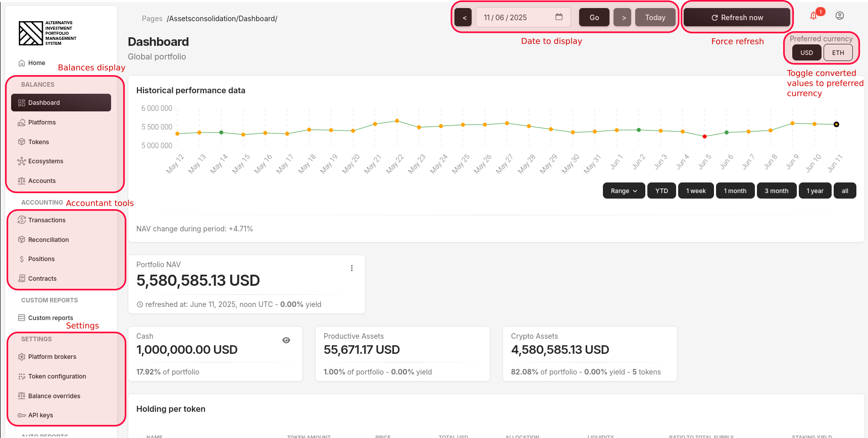 - Balances display: various display and aggregation of the assets
