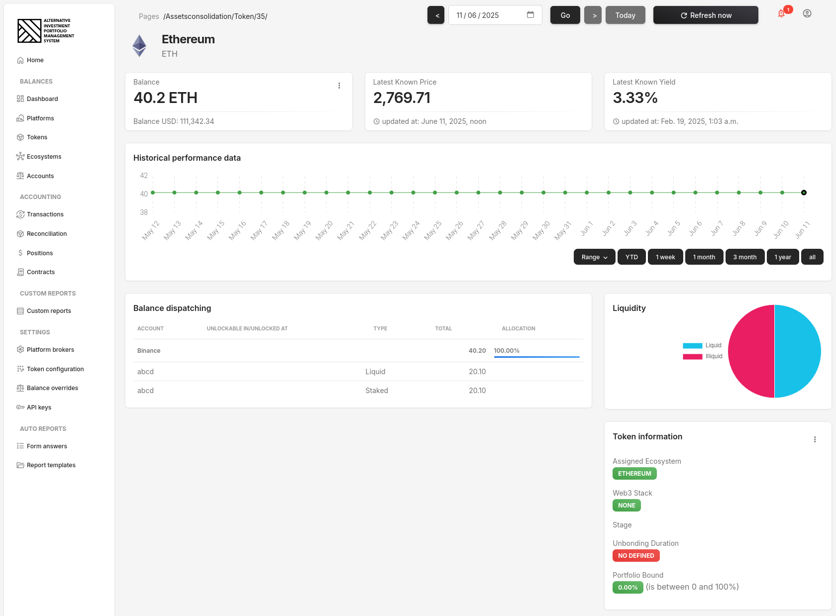 Token details Displays historical balances, token allocation, sub-balances by type, and liquidity distribution.